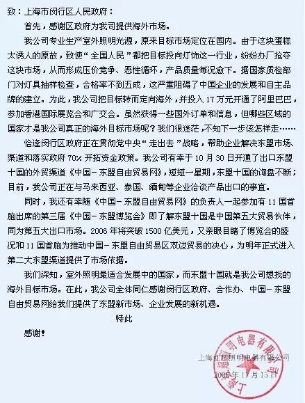 区政府为落实“走出去”战略,给我们提供的直通东盟市场的外贸渠道,使我公司实现了“不出国门,订单上门”的外贸模式,为此,特致信感谢!