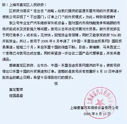 感谢嘉定区政府、合作办、中国-东盟自由贸易网提供的平台,使我司获得出口东盟十国的外贸渠道和订单。遗憾的是我司没有把握好8月10日申请开拓资金的截止日期,希望今后得到你们的提示。