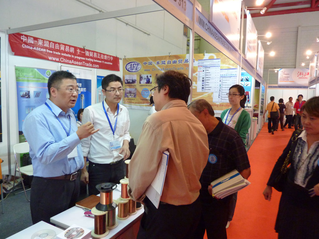上海新益电力线路器材有限公司於总工正逐一回答印尼客商关于三层绝缘线,电线电缆,绝缘绕组线,架空电缆,MC电缆,铝合金电缆的询价和性能,并带合作伙伴上海斯麟特种设备工程有限公司一起参展,所带200多本资料全部被印尼客户拿走。