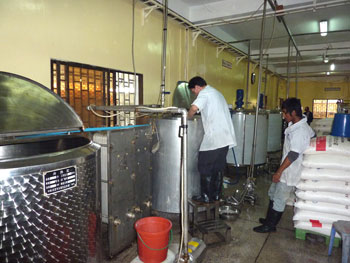 外企老总细仔看着上海申鹿均质机成套设备后对裘部长说:“这设备太好了,目前柬国内还没有一家采用这先进设备生产铝盒包装果汁饮料,所以铝盒包装的均从越南、泰国、马来西亚进口。”