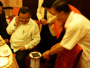 早有准备的朱总把太阳能热水器资料及太阳能灯演示给副总理看,副总理即新奇又高兴,并表示将先在旅游人次达2.4亿的世界奇观:大小吴哥窟旅游景点,宾馆大力推广使用,赵会长马上叫朱总多寄点样品推广。