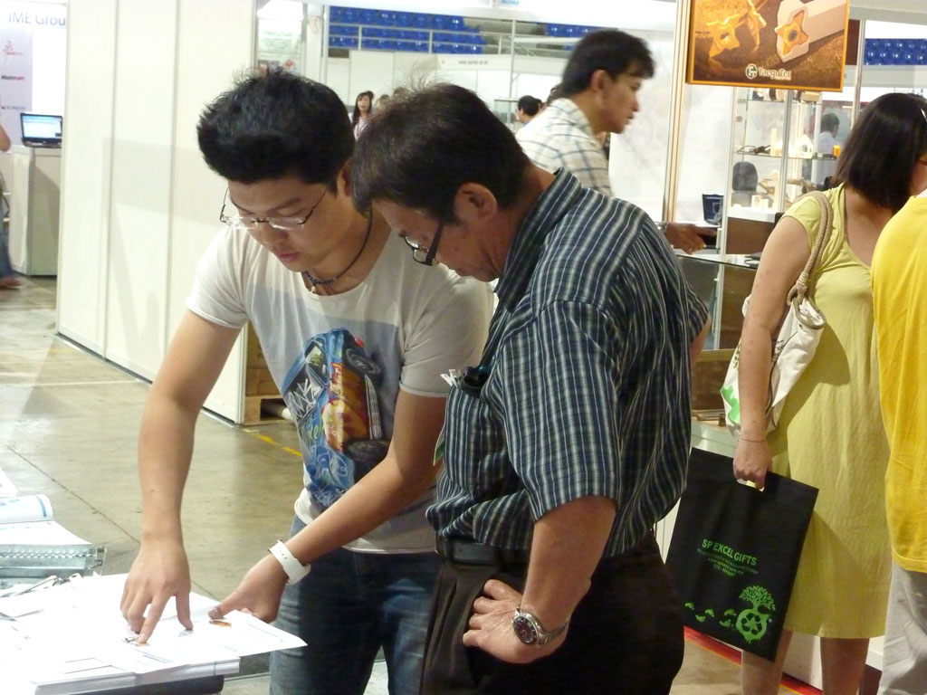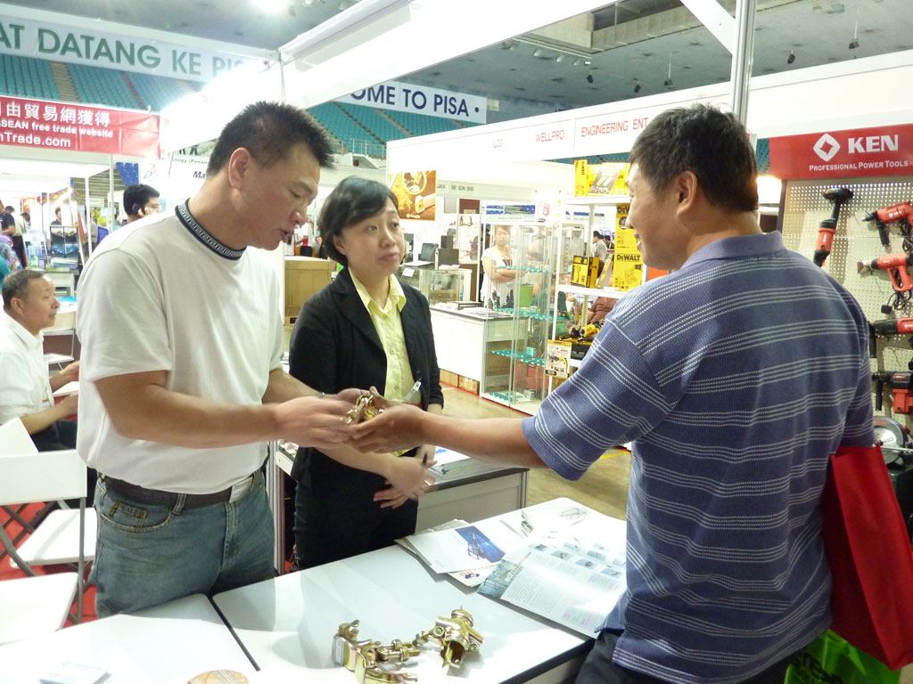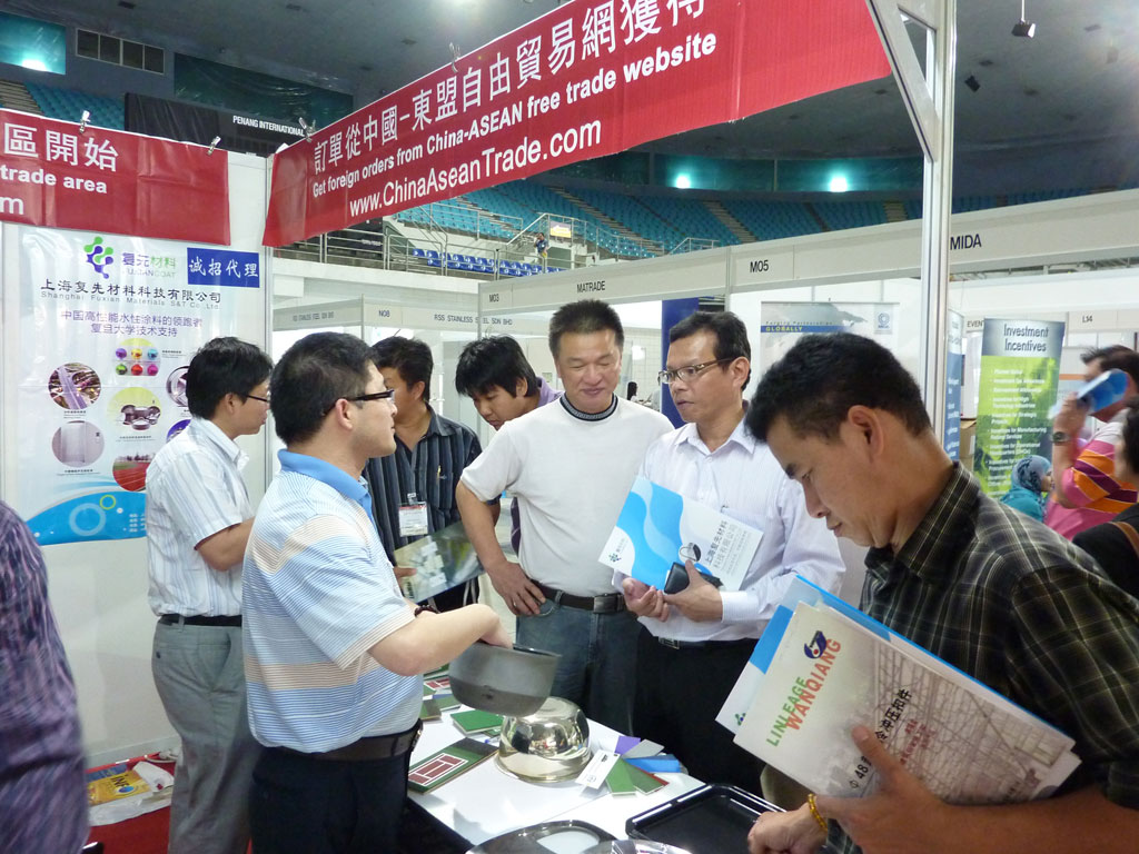 马来西亚中小型工业公会槟城颜会长(右2)率领企业前来东盟网展位洽谈,颜会长对复先相总说:“我找你这一产品有1年了,到商会详谈。”东盟网负责人(右3)陪同。