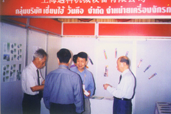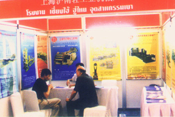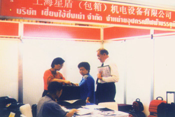几家泰国客商围在上海万强(集团)公司的展位前咨询,竞相提出在当地代理其超强钢管施工架扣件和食品加工设备。