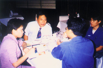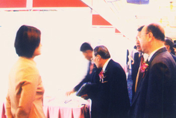 泰国中华总商会主席郑明如(右)在向上海新兴车灯厂茅祥根(左)了解生产情况并第二天又带来属下对口企业老总一起参与洽谈每月40万只摩托车灯具的订单事宜