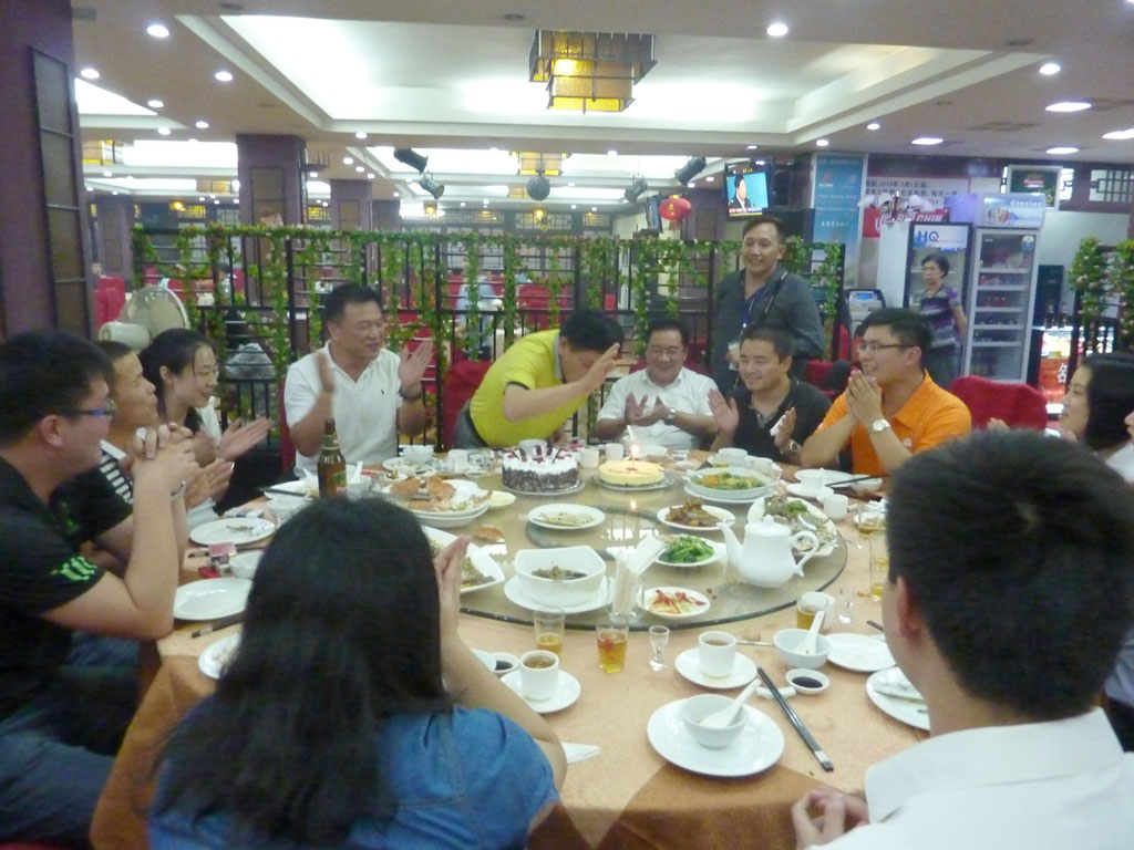 团队的力量,生日的快乐、海外的情调,蛋糕拨在寿星脸上身上、寿星反拨朱总脸上