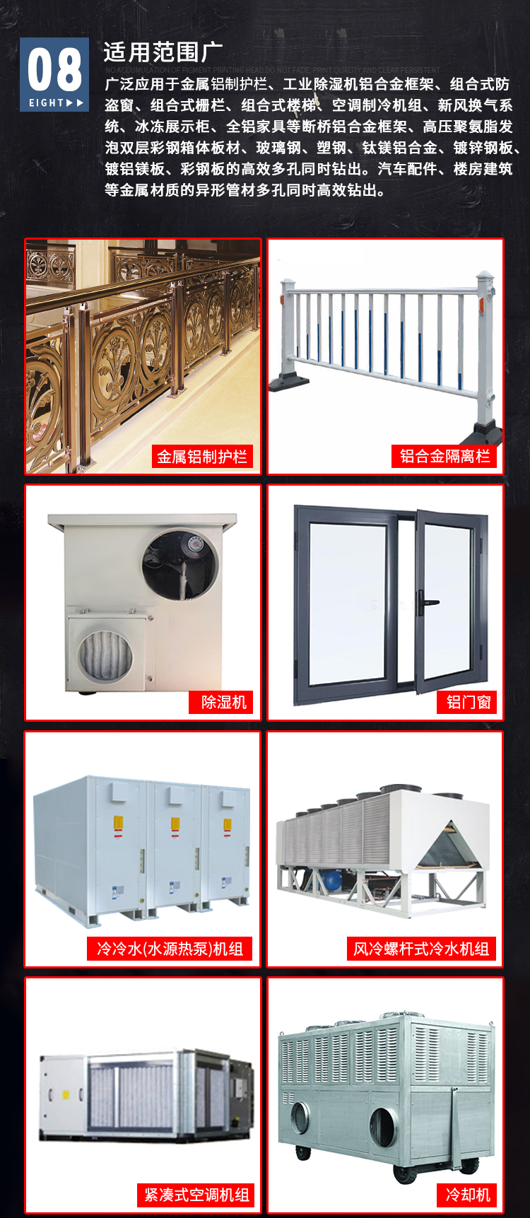 简单描述:久枫恒TSS-JX01-11多轴数控自动钻孔机专为空气除湿和干燥工业设备结构框架铝合金型材钻孔设计制造,11个孔位同时钻出,可钻到最大钻孔直径16MM,最大钻孔厚度80MM,采用数控摸屏控制,可单独钻1个或同时联动钻出11个钻眼,两孔之间距离160MM,工件总长4000MM,并可根实际需求定制孔距最少14MM,最大9000MM。 广泛应用于普瑞泰、湿美电气、百奥、多乐信、特美高、井泉、湿井、菱克、宇琭、德业等知名工业除湿干燥设备企业的空转轮除湿机、低露点除湿机组、手套箱全新风除湿机、移动除湿机、冷冻式工业除湿机等除湿行业使用的铝合金框架、高压聚氨脂发泡双层彩钢箱体板材的高效多钻出。 有效解决铝合金型材冲孔变形、长工件钻位数量多、铝条的夹缝里穿铁条度大打不穿、背面有毛刺及CNC加工中心效率低、成本高的难题。全自动钻孔、高效便捷,节省人力成本,套一键启停开关,一键式锁定松开快速稳固定位气动锁紧夹料装置,一套模具可装夹多种异形工件,傻式全自动化,操作简单,方便安全!